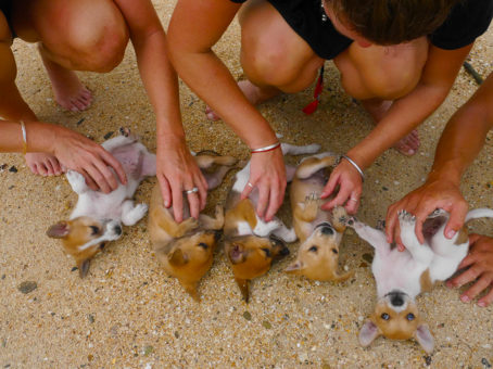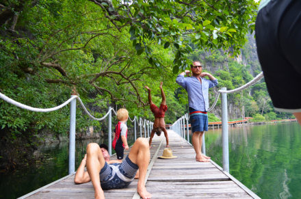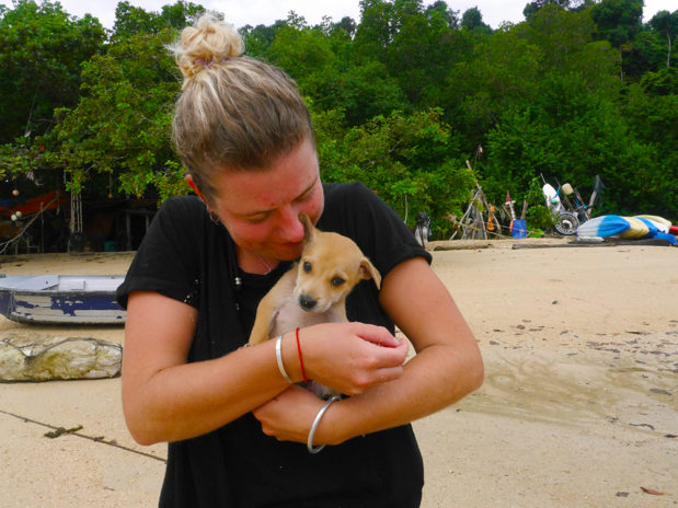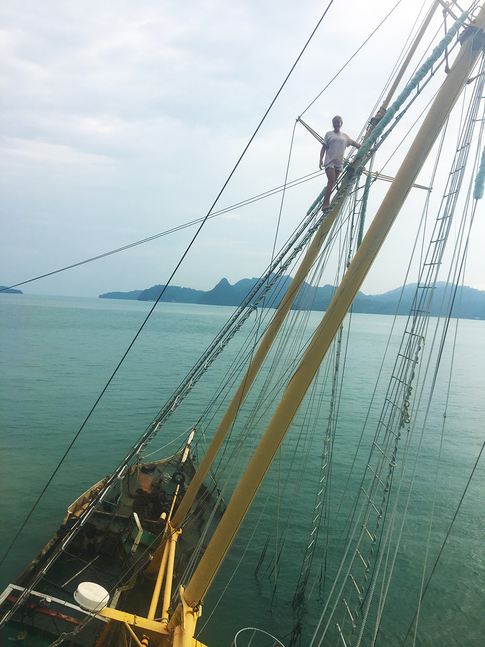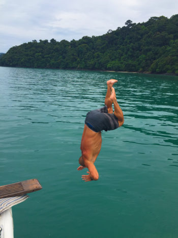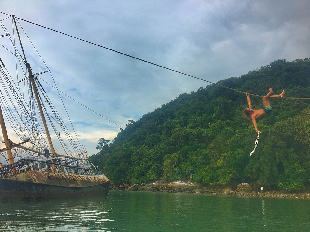 While Monica, Josefine, Olive, Ulla, Danny and Olivia conquered soaring “sky bridges”, Will, Gabbie and Ben and Thomas from Atlas explored spooky ship wrecks (which we of course backflipped off) during our stop on the main island of Langkawi. The cruising between islands here has been breathtakingly beautiful as we squeezed Bay Dreamer through high fjord’s and towering cliffs that separated powdery sand beaches and hid glassy fresh water lakes. Bush bashing our way to the base of cliff faces that we rock climbed for some spectacular views in the morning, then slack lining and hand standing our way along the beaches in the afternoon, we were greeted by 6 tiny island puppies on one of the islands. This time, Will’s squeals of excitement were the loudest.