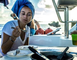 The food aboard now a days is amazing and we are eating like roman emperors on a daily basis! We have our two Frenchies Julien and Mylene to thanks for that!