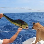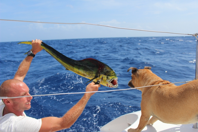There are a lot of flying fish in the ocean. They look like little birds franticly flying over the ocean. I don’t think they are very smart. One day a lone bird was flying over our boat and when we would scare up the flying fish, he would dive down for lunch. On the downside, he pooped on me. Yes! Right in the middle of the Caribbean Sea, and the only bird for 100’s of miles pooped and it landed on me – what luck! Anyway, a couple of flying fish flew into the boat during the night. We used them as bait the next day. I guess they are not very good bait, because we only caught one fish during the entire duration.