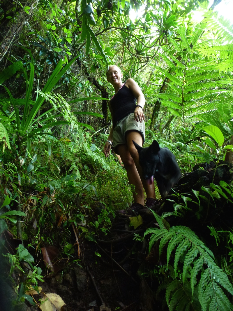 Satisfied and happy and swarmed by mosquitos we started to slip back down again, and hey!!! Did I mention that it was slippery ??? :- ) holding on to roots and tree trunks and stones we went down, by the time – dirty all over, sweaty and with shacking legs. The dog used every tiny stop to close his eyes and rest, obviously not used to walks like that, we named him Zorro and Danny wanted to adopt him immediately – Of Course.. Like every dog on every Island.. (thinking of Blancita from Islas de las Perlas in Panama- remember??) I think if Anna is not stopping him every time – we would have a whole wolf clan by now : – ) with Vera as pack leader, the queen on her thrown – – hahah what a funny thought…